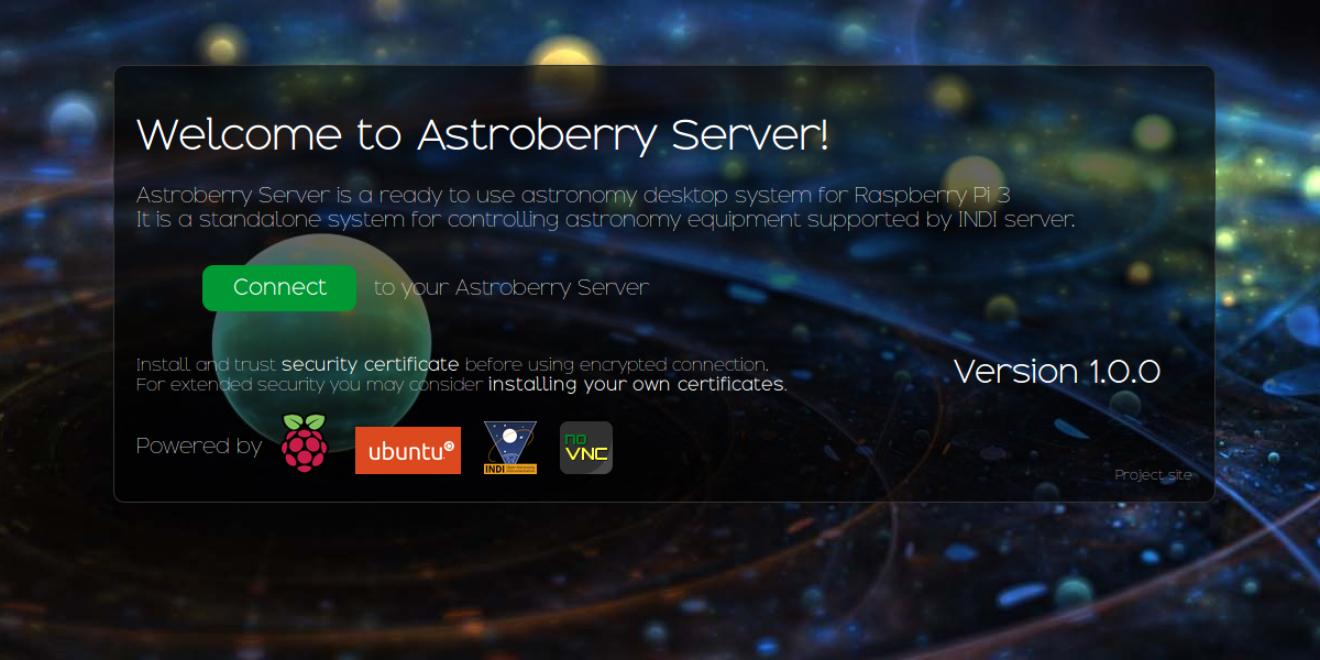Initial version of the system was called Astroberry Server 1.x and was released in May 2017. Astroberry Server was a preconfigured desktop for Raspberry Pi 3 (32bit) with KStars, Ekos and INDI server. It was based on Ubuntu Mate 16.04, accessible from a browser, VNC client or SSH. It worked as a virtual wireless access point (VAS) and WLAN client at the same time.