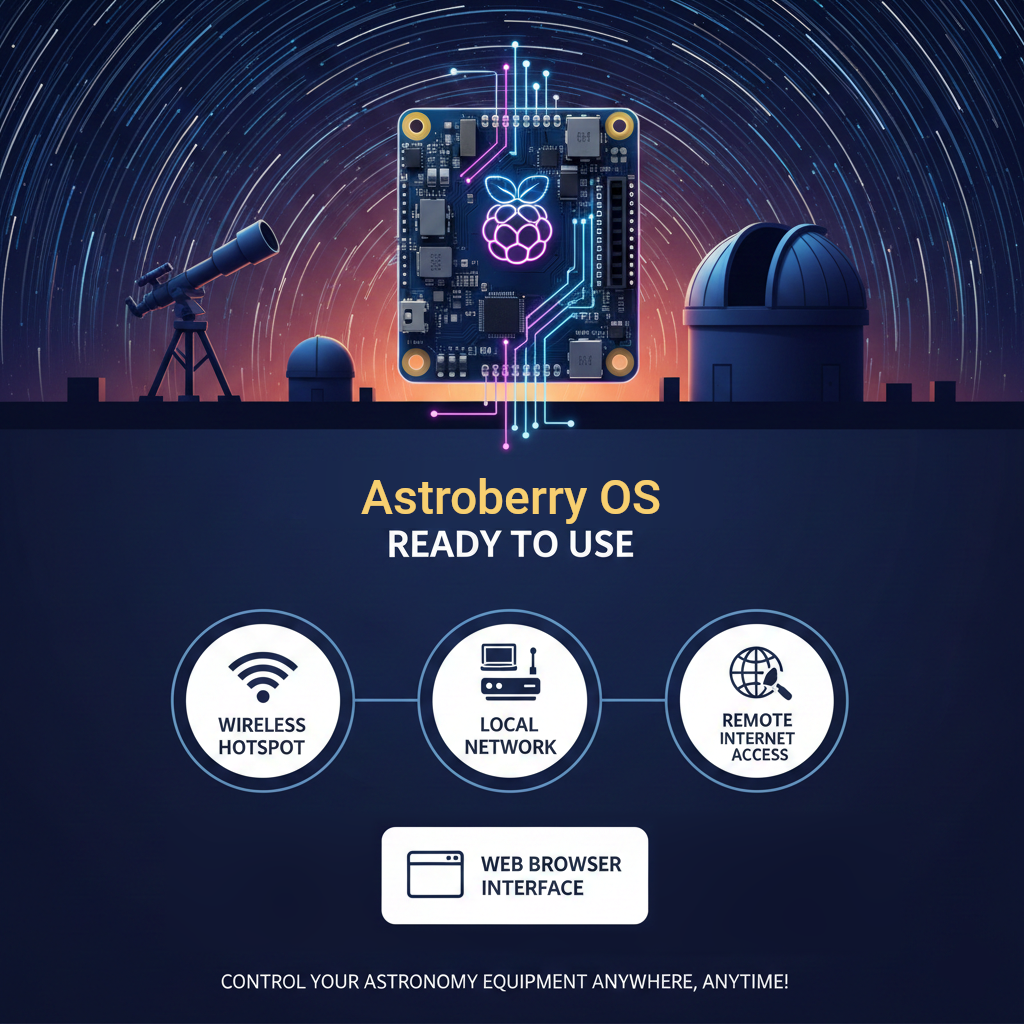 Astroberry OS is a a free and open-source operating system for Raspberry Pi for controlling astronomy equipment. It contains a collection of software packages for astronomy. With Astroberry OS you can remotely control a telescope, a focuser, a camera or the entire observatory, wherever it is located - in your backyard or hundred kilometers away. Your equipment is connected to Raspberry Pi, powered by Astroberry OS, and is accessible with a web browser, via a wireless hotspot, local network or the Internet.