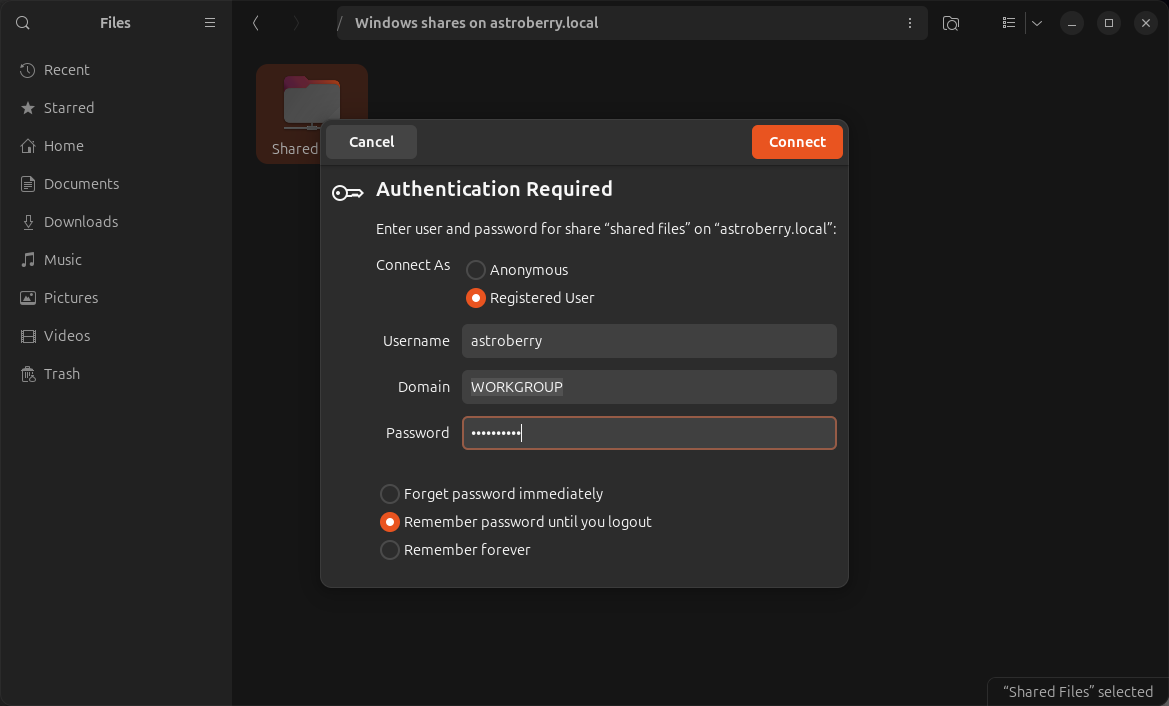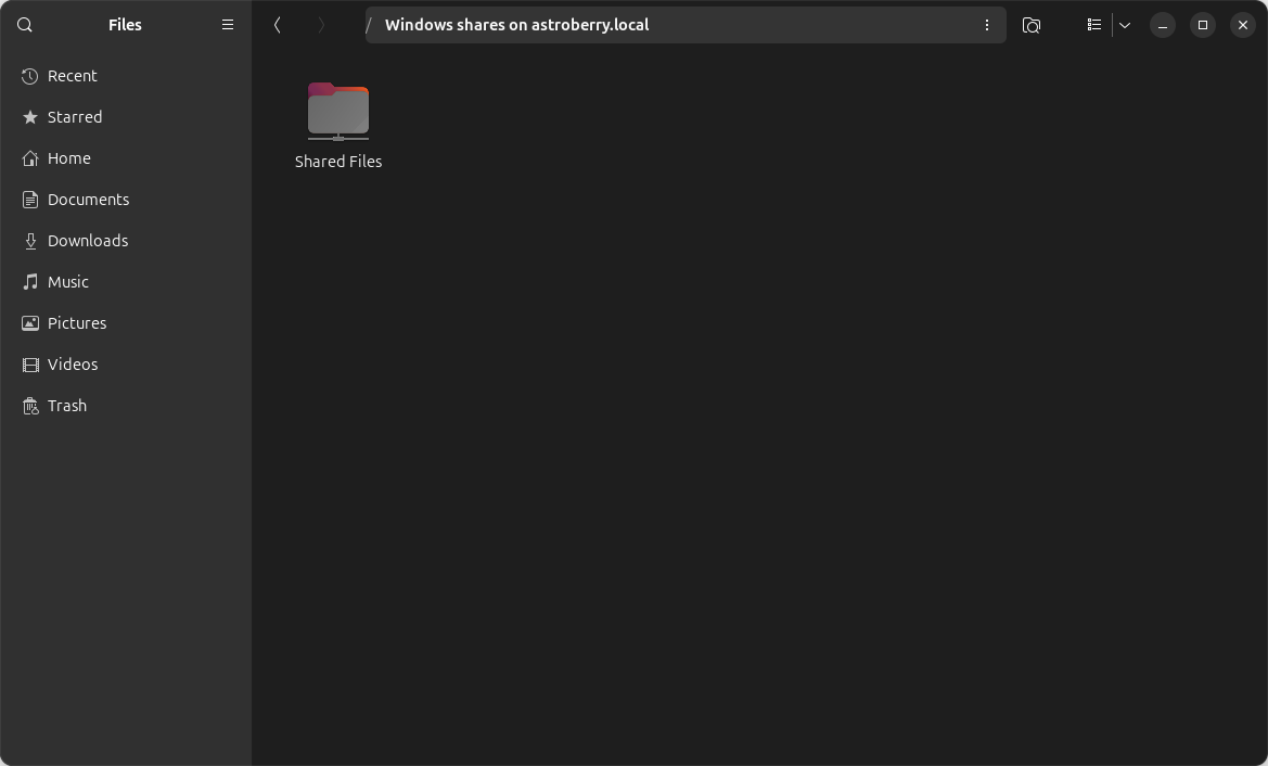 Default configuration of Astroberry OS shares a directory /home/astroberry/Shared over a network. Directory is accessible only to an authenticated user, so you have to login to access shared directory.