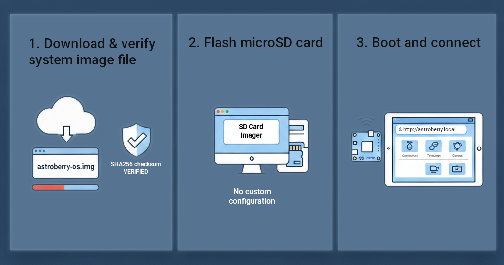 The simplest way to run Astroberry OS is to flash microSD card with a system image file. You can do this in 3 simple steps.